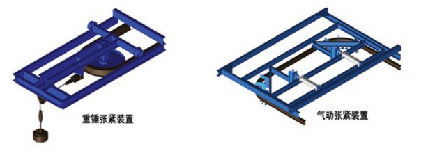 張緊裝置結(jié)構(gòu)采用重錘或氣動張緊,光輪或滾子列回轉(zhuǎn),張緊工作行程可達700毫米,可保證鏈條初張力不變,工作可靠,可滿足輸送機在任何工作環(huán)境下安全工作