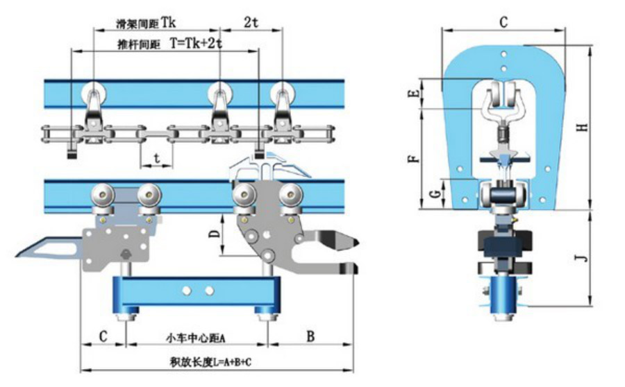 ZHZWJ4、ZHZWJ6積放式輸送機系統(tǒng)承載軌到采用特制的單面翻邊高錳合金槽鋼,使積放小車導輪與軌道之間的接觸由原來的線接觸變?yōu)槊娼佑|,提高了系統(tǒng)運行的穩(wěn)定性和可靠性。新型的前小車采用獨特的設(shè)計,將升降爪和止逸爪有機的結(jié)合為一體,簡化了整體結(jié)構(gòu),保證了升降爪垂直升降的靈活性和可靠性。前鏟和尾鏟設(shè)計新穎,使系統(tǒng)的積放平穩(wěn)、精確。道岔采用全新的設(shè)計,拋棄了原來的傳遞方式,使各種道岔完全形成標準化系列,簡化了線路設(shè)計程序。